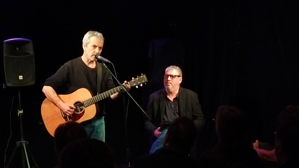 1135015932164263849.jpegVoilà un bel épisode qui s’est écrit aujourd’hui encore, dans le décor feutré d’Agend’Arts, à la Croix-Rousse, pas loin (200 m) de là où habitait ma grand-mère, de la fenêtre du 1, rue du Mont d’Urville, au croisement de la rue Dumenge, le territoire connu de Jean-Christophe Géminard, qui a interprété Jean-Louis Murat pour moi, sans hésitation, avec juste la dose de questionnement sur la légitimité qu’il a toujours quand il joue et que beaucoup d’autres n’ont jamais. D’où l’essai de présenter notre Un monde sans Murat, comme ça, sans même de livres, en l’occurrence, avec en alternance, lecture d’extraits et chansons appropriées, réinterprétée, qu’on donnerait à voir et entendre à ceux qui ne l’avaient jamais fait encore. Ça a commencé aux alentours de 11 heures, pour un brunch à la Croix-Rousse, comme je n’avais pas fait depuis une éternité. Quand on a commencé, l’idée était de me substituer une voix off, la mienne en l’occurrence, empruntée à un entretien de l’Au-delà mené avec Jean-Louis, chanson en sus. Ça fonctionne, JC chante deux chansons (pour ne pas passer à un mode trop classique chanson-texte), je lis un extrait du Portrait de JLM. Ensuite, JC chante Vénus, extrait de ce fabuleux concert de 1993, dont j’ai tiré une nouvelle dans le orgueil. Je mets en avant la présentation du livre– que je n’ai pas à vendre – lie le chapitre Murat et les femmes, à Plus vu de femmes et l’Irrégulière, que j’attendais avec fébrilité. Pourquoi ? Je ne veux pas le dire ici, je le dirai après le tout dernier concert qu’on aura interprété fin décembre. Je trouve JC plus juste que je l’ai jamais trouvé, dans le jeu, dans l’interprétation, je suis ravi qu’un homme comme lui reprenne du Murat : lui-même doit se juger illégitime, alors qu’il l’est beaucoup plus que d’autres. J’ai ce sentiment que notre jeu fonctionne, entre la distance que je mets dans le discours et le sérieux qu’il met à l’interprétation: il y a un équilibre. C’est sympathique, parce que quand tu joues avec la lumière qui éclaire la scène, tu as l’impression d’être à l’Olympia. Il n’y a que les illusions qui diffèrent, on est là tranquillement tous les deux devant une vingtaine de personnes, ce qui suffit à notre appel. Une fois revenu parmi les vivants, au moment, j’entends plusieurs personnes qui me disent que 40 minutes, ça n’était pas assez long.. En guitare voix et support littéraire, pour moi, c’était largement suffisant, mais tant mieux si cette impression a été laissée. L’anecdote ultime de cette rencontre, c’est que j’ai promis une place en loge pour notre prochain Bercy à la personne qui ferait le lien entre le Café des écoles, cette chanson que j’ai écrite pour Eric Hostettler, et Jean-Louis Murat: à peine revenu parmi les mortels, une dénommée Christelle fait le lien avec Amour zéro, extrait de l’album Mademoiselle Personne, BO d’un film jamais sorti, en inédit, du Live 93. Chapeau, mais c’est une ayatollah, dit-elle elle-même, et ça me fait bien rire, en perspective de tous les ceux du même nom qui vont ignorer mon livre sans penser une seconde qu’ils se tirent une balle dans le pied. Je ne peux pas revenir sur le moment le plus expressif du récital, pour moi, ce serait énoncer des secrets qui sortiront quand j’en aurai fini. Je n’ai pas remplacé Jean -Louis Murat, JC, non plus, ça n’était aucunement l’intention, mais j’ai la prétention de penser que ça a participé à son travail, à son œuvre. On n’a volé le temps de personne, on s’est retrouvé ensemble, autour d’un brunch et d’un apéritif, autour de l’œuvre du Bougnat, et en cela pour moi c’est réussi. Il me reste, dans cette assemblée, a annoncer les dates en Librairie, à Saint-Étienne, à Lyon, à prévenir d’une interview qui m’attend avec Gaële et Guillaume pour une radio lyonnaise, à dire aux gens qui étaient là que s’ils veulent le livre, eh bien il faudra le commander ou revenir à la prochaine rencontre parce que déjà la journée dédiée s’est terminée. Je sors fatigué de la rencontre, mais c’est parce que je dois bien à Jean-Louis Murat, parce qu’il y a une espèce d’urgence à demander aux gens de l’entendre et de le comprendre. Quand  JC a terminé par le Café des écoles - il connaît bien le morceau - je savais qu’on allait confronter le  lieu  à sa puissance de temporalité. Je me réjouis d’avoir participé à ça et d’avoir fait rire et entendre la voix du Bougnat. On était bien à Agend’Arts ce matin, le reste résonnera longtemps.