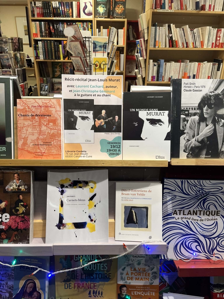 Au début, quand les annulations se sont succédé, comme à Gravelotte (grippe, pluie, flemme, indifférence…), je me suis un peu inquiété et effectivement, au regard des deux premières rencontres que j’y ai fait autour de Liliane Benelli et des Noz, l’affluence était un peu clairsemée, hier, quand j’ai présenté mon Monde sans Murat hier, à la librairie Cordelia de Caluire, chez Anthony, ce libraire qui se bat pour faire découvrir une autre littérature que celle qu’on veut imposer. Il m’aime bien, trouve que deux imprévisibles comme Murat et moi (c’est son mot) valaient le coup de rallonger une déjà longue journée, puisqu’il recevait Annie Duperrey dans l’après-midi. C’est donc devant une quinzaine de personnes que Jean-Christophe Géminard et moi avons entamé notre récit-récital, rodé il y a trois semaines à Agend’Arts et repris dans l’après-midi, chez lui. Ça permet de lire des extraits de l’entretien de l’Au-delà - le premier titre joué - du portrait - qui instaure le rapprochement avec le Temps retrouvé proustien - ça crée un équilibre, ça n’est pas trop long, dira ma nièce et ça permet à JC de jouer les morceaux par deux, sauf quand il joue Verseau et que je l’associe à l’épisode des Endimanchées du Transbordeur, la première nouvelle du recueil. Guillaume a fait le job, la veille, en interview, je peux m’appuyer sur ce qu’il a dit de ma démarche, celle d’un artisan vers un autre artisan, Anthony me demandera par la suite quelle est la réception d’un tel ouvrage chez les fans de Murat, je répondrai que je m’en fiche, les derniers mots de la Vie d’artiste de Léo Ferré. Déjà cité pour Nuits d’absence et la sonorité d’un mot comme Arkhangelsk, je (me) cite. Il y a ce moment où, quand il a chanté Plus vu de femmes, JC lance une intro douce et où, à la surprise générale - mais sur demande expresse du libraire - c’est moi qui entonne l’Irrégulière, cette chanson de Dolorès que Jeanne Moreau a refusée (sic) et que Samantha Barendson clôt d’un extrait du livre: